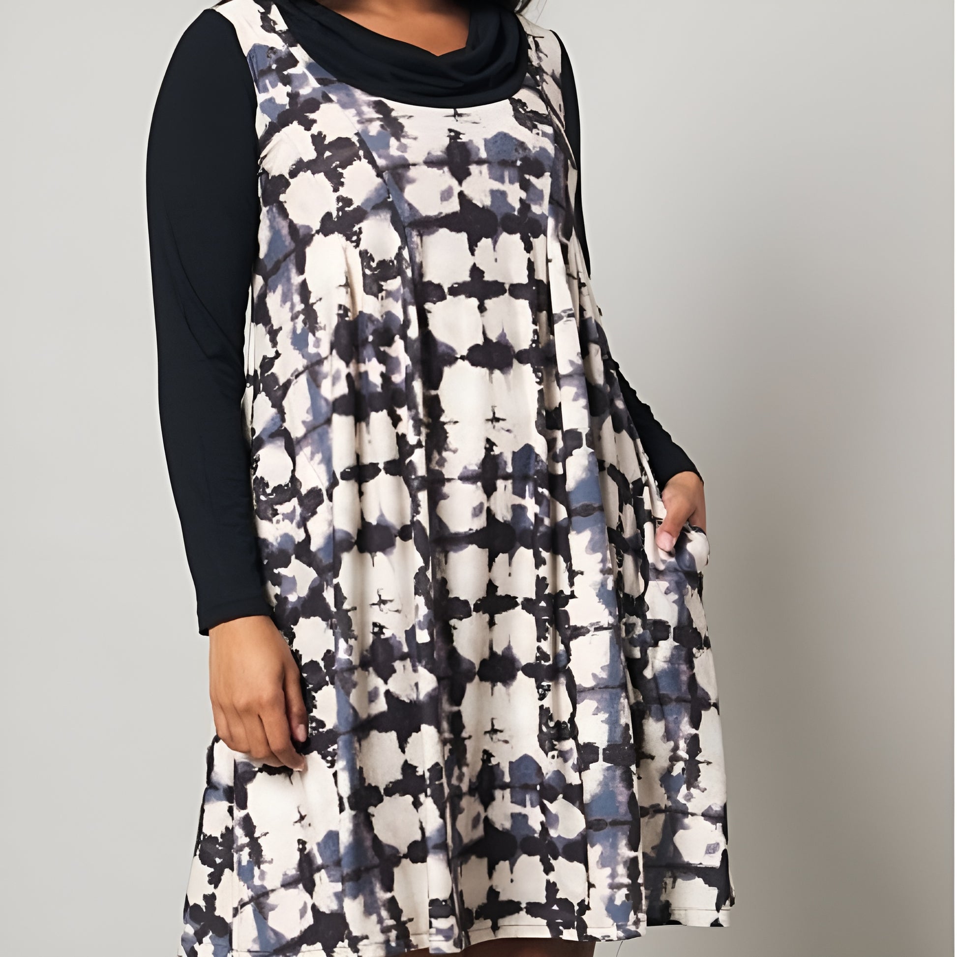 Vestido estampado con mangas y cuello de viscosa a contraste, efecto pichi. El cuerpo del vestido es en tejido de punto peach, tipo melocotón y de corte ultra evasé, con bolsillos laterales. Perfecto para eventos o el día a día con un toque especial. Disponible de la S a la 6XL. Moda actual para cuerpos reales.