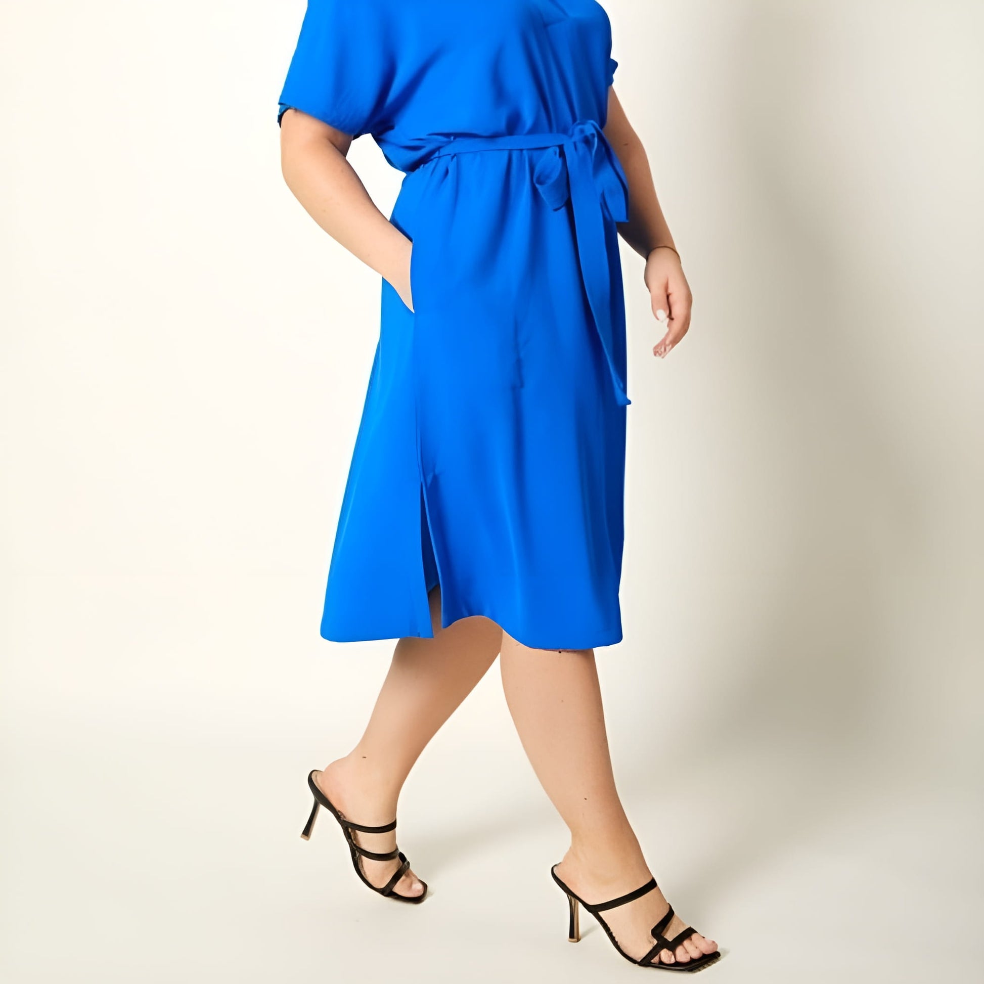 Vestido de corte holgado en tejido liso tipo crepé, con bolsillos y cuello tipo polo. El cinturón a juego permite diferentes opciones de estilismo, atado delante o detrás. Una prenda cómoda y con estilo, ideal para el día a día. Disponible hasta la talla 6XL. Fabricado en España.