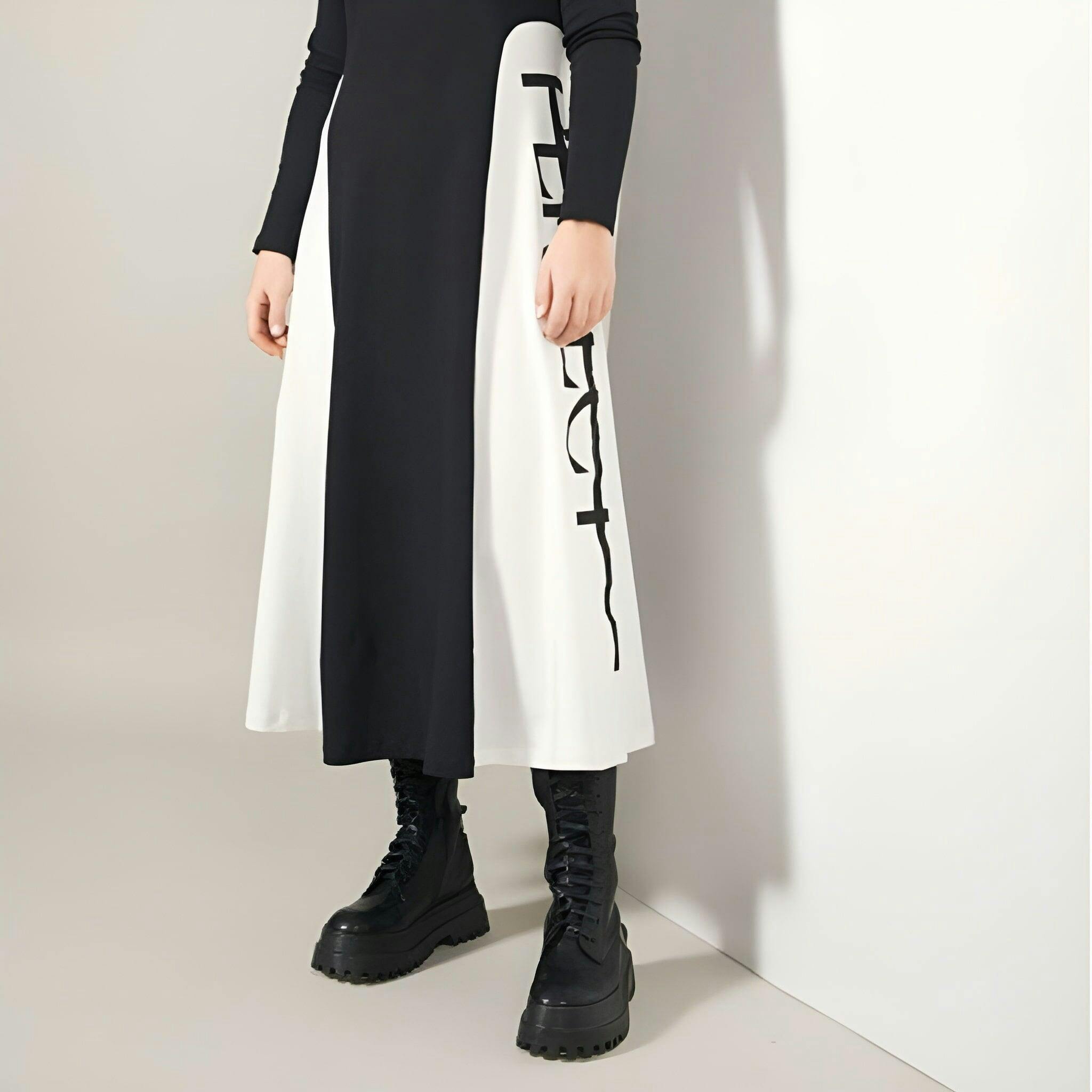 Vestido midi evasé en bicolor con piezas a contraste en los laterales. Su juego visual estiliza la silueta y aporta carácter gráfico al diseño. Una creación contemporánea que destaca por su equilibrio entre sencillez y perfección.