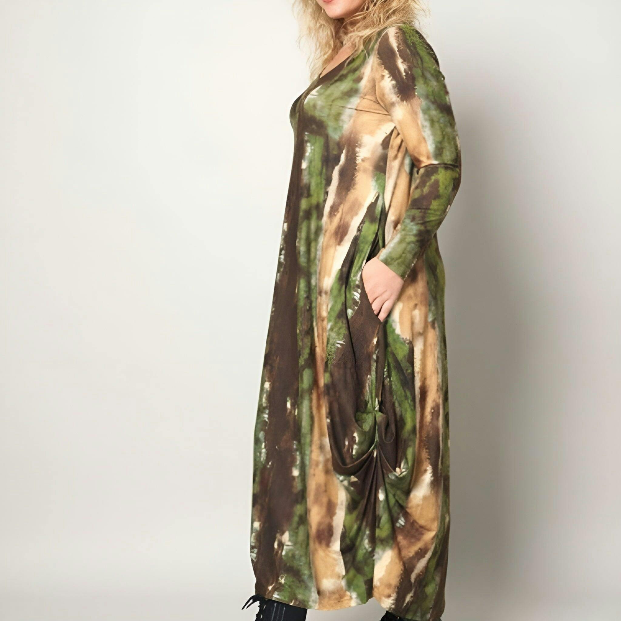 Vestido midi estampado de corte globo con fruncidos, en tejido de punto peach, efecto piel de melocotón. Tiene bolsillos laterales y apertura trasera en el bajo para mayor comodidad. Perfecto para eventos o el día a día con un toque especial. Ideal para mujeres curvy que buscan estilo y comodidad en todas las tallas.