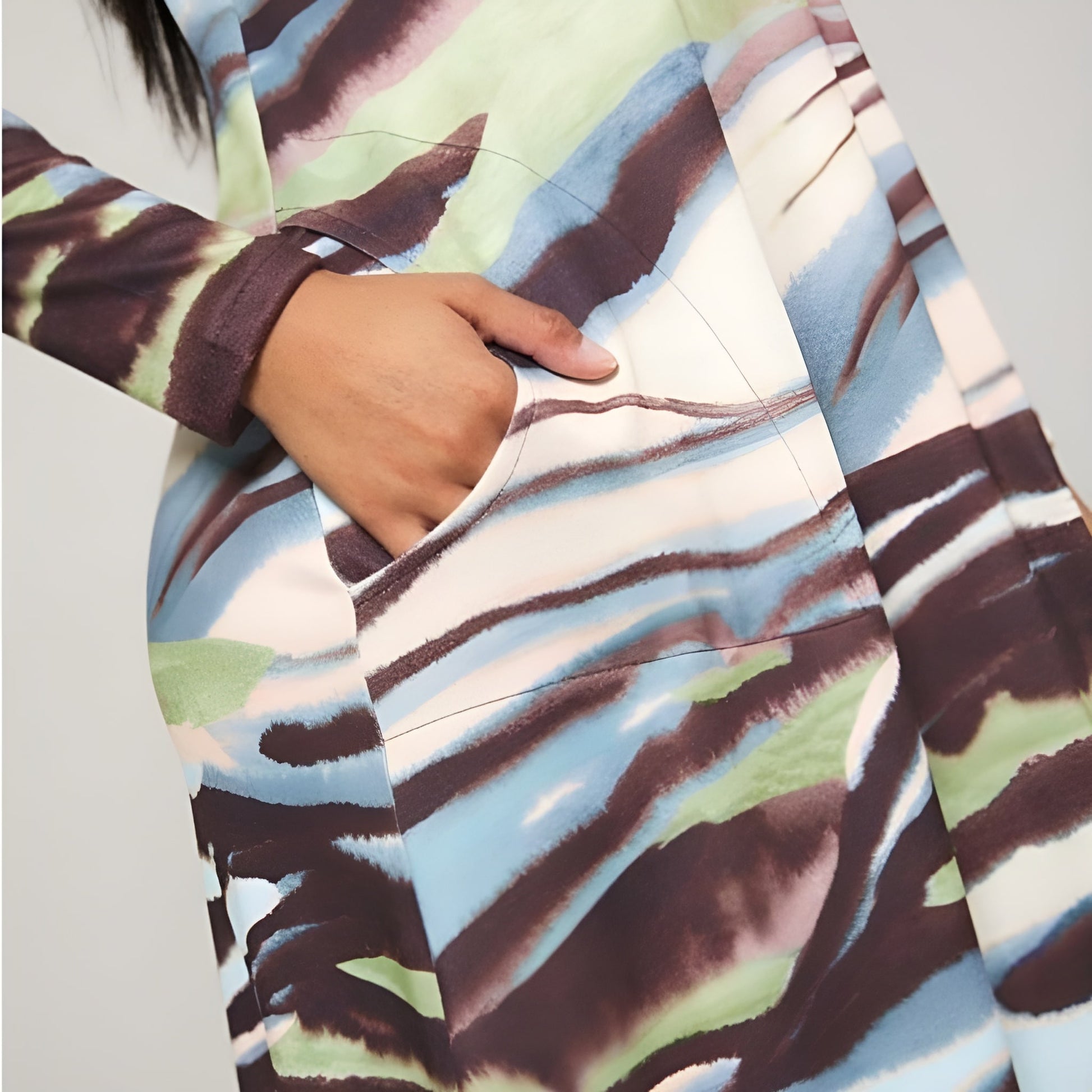 Vestido estampado evasé de manga larga en punto fino de lanilla y con bolsillos. La pieza del cuello es de quita y pon para que puedas llevarlo como más te guste. Perfecto para eventos o el día a día con un toque especial. Ideal para mujeres curvy que buscan estilo y comodidad en todas las tallas.
