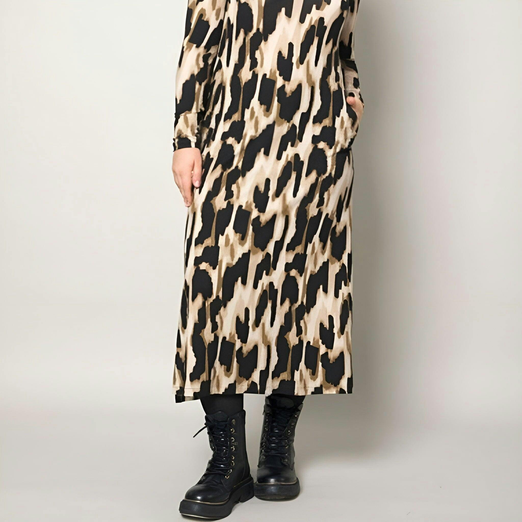 Vestido midi estampado con bolsillos, aberturas laterales, escote redondo y manga larga. Tejido de punto viscosa para una caída y comodidad excepcionales. Perfecto para eventos o el día a día con un toque especial. Perfecta para cualquier ocasión. Moda inclusiva y moderna.
